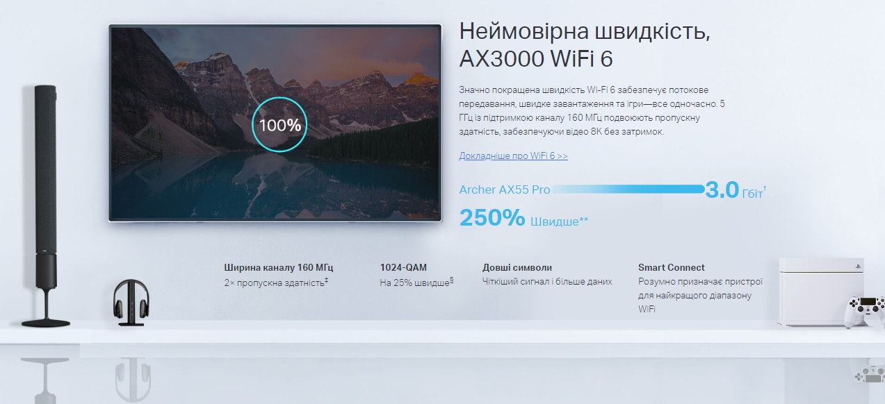- Швидший дводіапазонний Wi-Fi AX3000: до 3,0 Гбіт/с (2402 Мбіт/с + 574 Мбіт/с) Wi-Fi для швидшого перегляду, потокового передавання та завантаження одночасно.