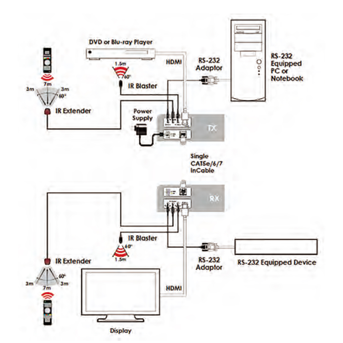 Відео та аудіо без стиснення можна передавати на відстань до 70 метрів у 1080p або 40 метрів у 4K. з функцією PoC і додатковими перевагами керування через вбудовані порти RS-232 та ІЧ-порти. Цей сімейний дизайн технології HDBaseT дозволяє повністю використовувати HDMI і контролювати через кабель CAT5e/6/7.