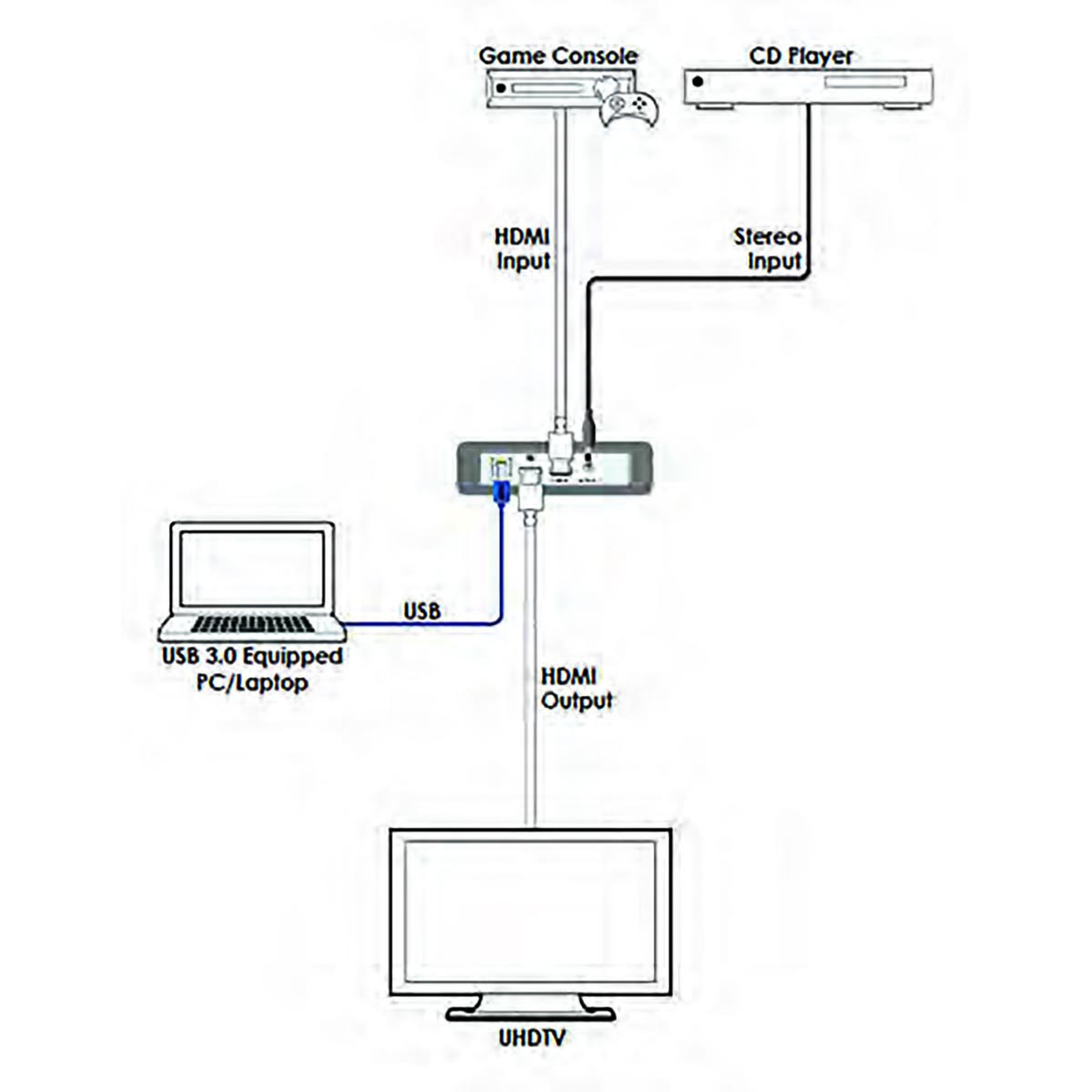 HDMI-джерела з роздільною здатністю до 1080p60. Використання спеціальної функції стабілізації синхронізації відео допомагає гарантувати, що потік захоплення з USB не застрягне і не перерветься, навіть якщо джерело вхідного сигналу HDMI працює з перебоями або відключається. Цифровий стереозвук з HDMI (LPCM 2.0) або 3,5-мм аналогового аудіовходу буде захоплюватися за допомогою джерела відеосигналу HDMI, яке можна вибрати за допомогою конфігураційного програмного забезпечення. Захоплення через USB здійснюється з використанням стандартів UAC (USB Audio Class) і UVC (USB Video Class), що дозволяє пристрою підтримувати найпоширеніші програми для захоплення відео, чату або потокового мовлення, включаючи підтримку безкоштовного програмного забезпечення для потокового мовлення OBS (Open Broadcaster Software), яке доступне для ПК з ОС Windows, macOS і Linux. Пристрій живиться безпосередньо від порту USB 3.0, тому зовнішнє джерело живлення не потрібне (при підключенні через USB 2.0 потрібен Y-кабель для забезпечення необхідної потужності). Наявність і доступ до керованих функцій пристрою залежать від використовуваного програмного забезпечення для захоплення.