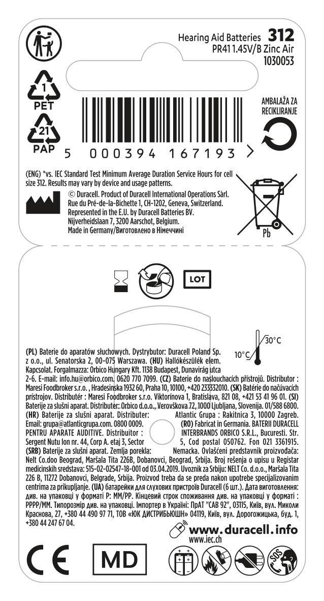 <p>Почуйте все завдяки тривалому терміну служби спеціальних батарейок для слухових апаратів Duracell Hearing Aid розміру 312 з EasyTab®.</p>