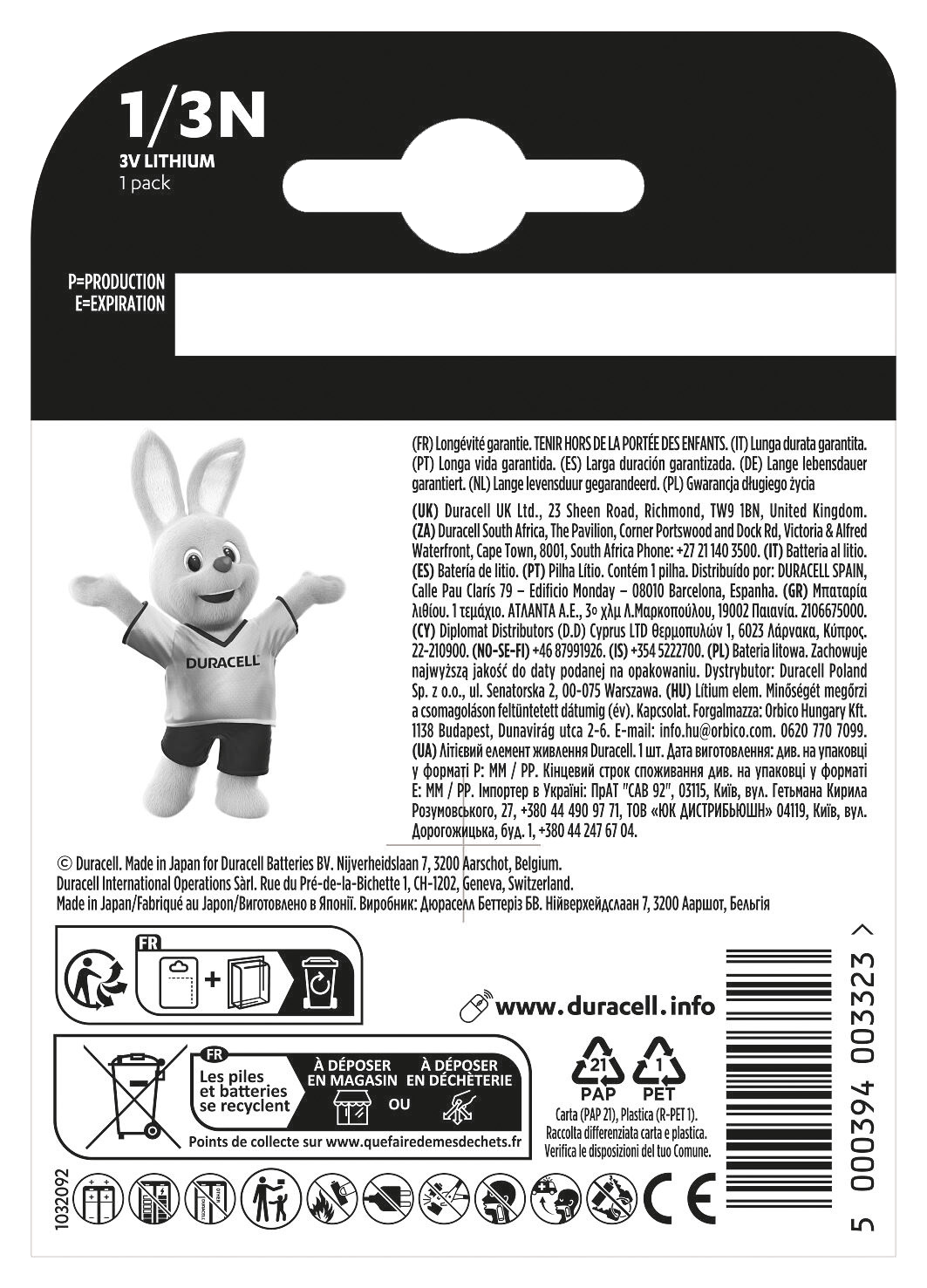 Спеціальна літієва батарейка Duracell 1/3N 3V, (2L76 / CR1 / 3N / CR11108), 1 шт. в упаковці