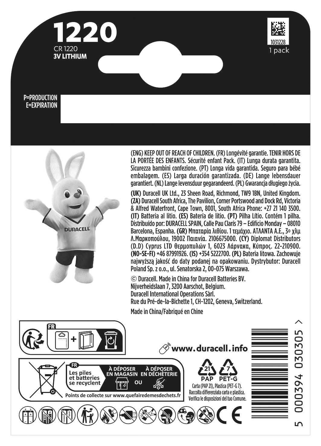 <p>Спеціальні літієві батарейки типу «таблетка» <strong>Duracell CR1220</strong> мають гарантовано довгий термін служби у ваших спеціалізованих пристроях. Для забезпечення безпеки ваших дітей вони спроектовані з упаковкою Baby Secure, яка має подвійний блістер, що важко відкрити без ножиць. Вони підходять для використання в автомобільних ключах, маленьких пультах дистанційного керування, фітнес-годинниках та інших носимих пристроях, вагах, сенсорах, медичних пристроях (глюкометрах, цифрових термометрах), спортивних пристроях (пульсометрах, велосипедних аксесуарах). З гарантією зберігання до 10 років ви можете бути впевнені, що вони будуть готові, коли вам знадобляться.</p>