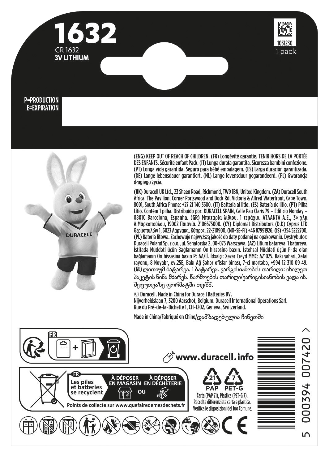 <p>Спеціальні літієві батарейки типу «таблетка» <strong>Duracell CR 1632</strong> мають гарантовано довгий термін служби у ваших спеціалізованих пристроях. Для забезпечення безпеки ваших дітей вони спроектовані з упаковкою Baby Secure, яка має подвійний блістер, що важко відкрити без ножиць. Вони підходять для використання в автомобільних ключах, у різних видах пультів дистанційного керування, фітнес-годинниках та інших носимих пристроях, калькуляторах, камерах, сенсорах, автомобільних сигналізаціях, медичних пристроях (глюкометрах, цифрових термометрах). З гарантією зберігання до 10 років, ви можете бути впевнені, що вони будуть готові до використання, коли вони вам знадобляться.  </p>
