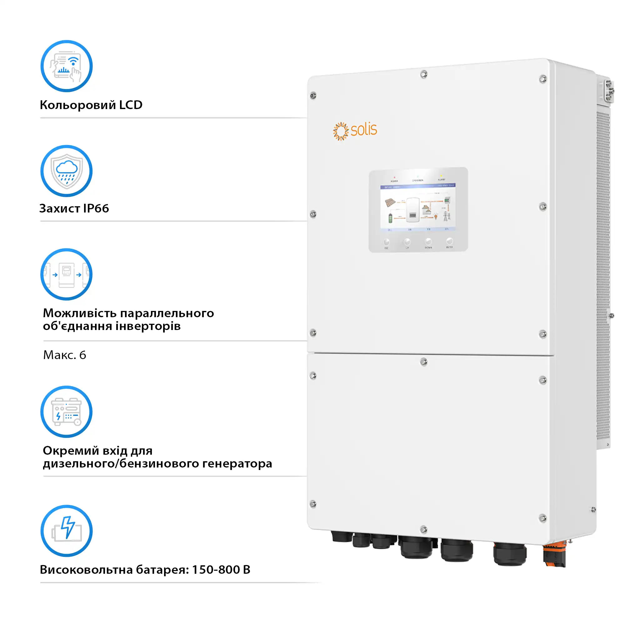 Solis S6-EH3P30K-H поєднує високу потужність, гнучкість підключення та надійність у комерційних гібридних системах. Інвертор забезпечує ефективне використання сонячної енергії, стабільне живлення та швидке резервне перемикання без складних додаткових налаштувань.